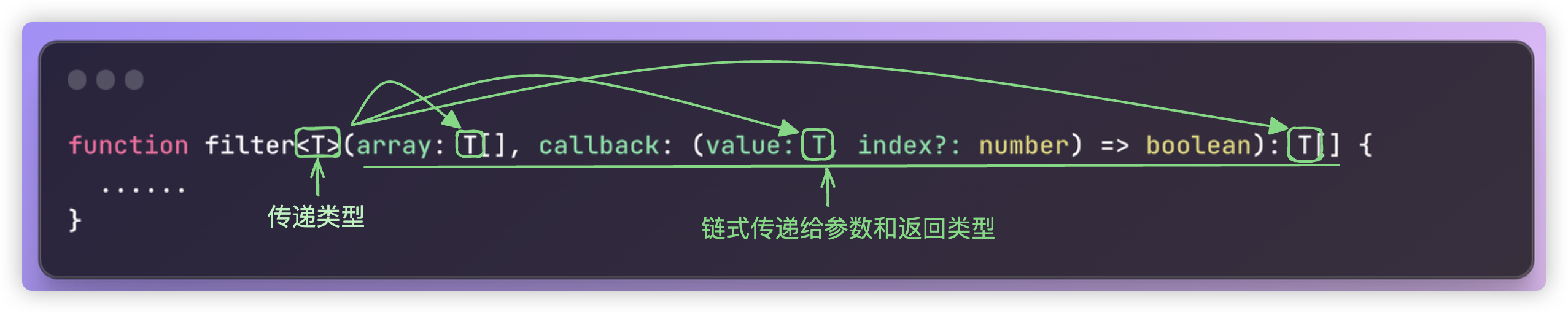 当我们把函数的参数注解为fn(n:number)的时候,参数n的值就被约束为了number类型。
