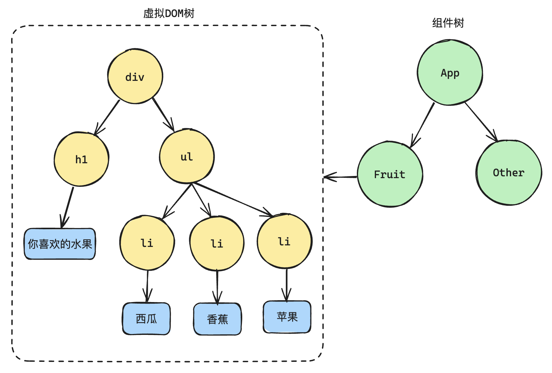 当我们把这段结构封装为组件 Fruit,并在其他组件中复用,组件与组件之间形成一棵更高层次的树,即“组件树”。每个组件内部的视图由一组虚拟 DOM(vnode)描述,最终映射为真实 DOM: