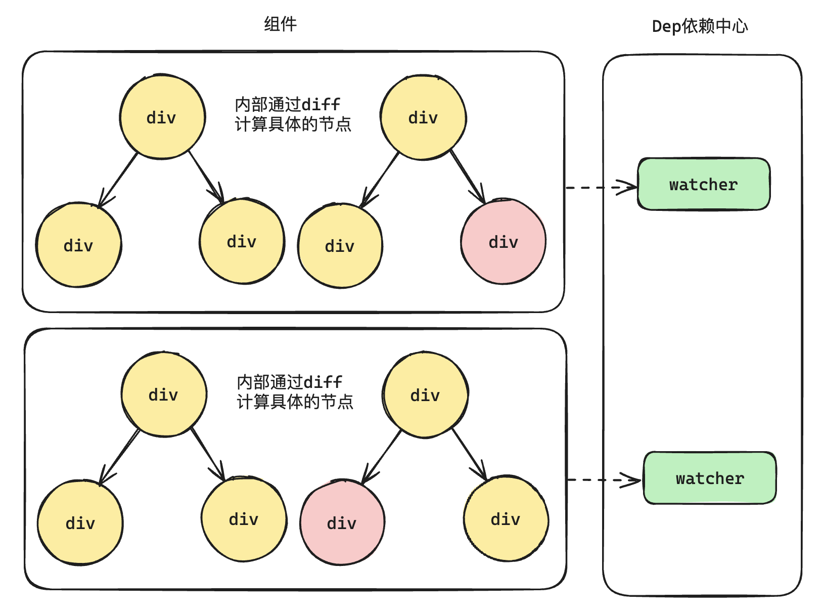 Vue2.x 引入虚拟 DOM,并将响应式的粒度提升为“组件级 watcher”(一个组件对应一个 watcher)。这带来新的问题与机会: