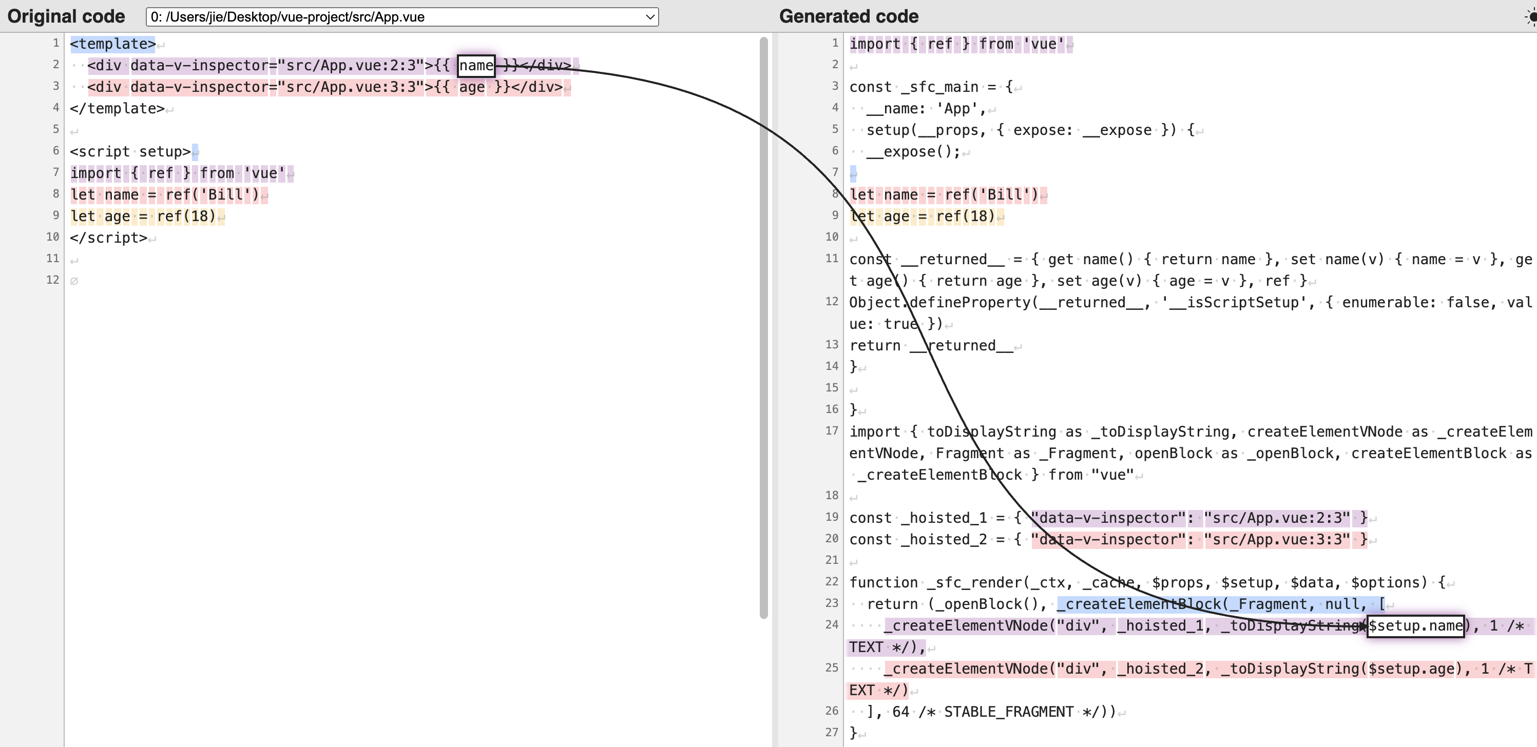 • _sfc_render 中通过 $setup.name$setup.age 访问这些访问器属性,产生“读取拦截”,从而与渲染函数建立依赖。