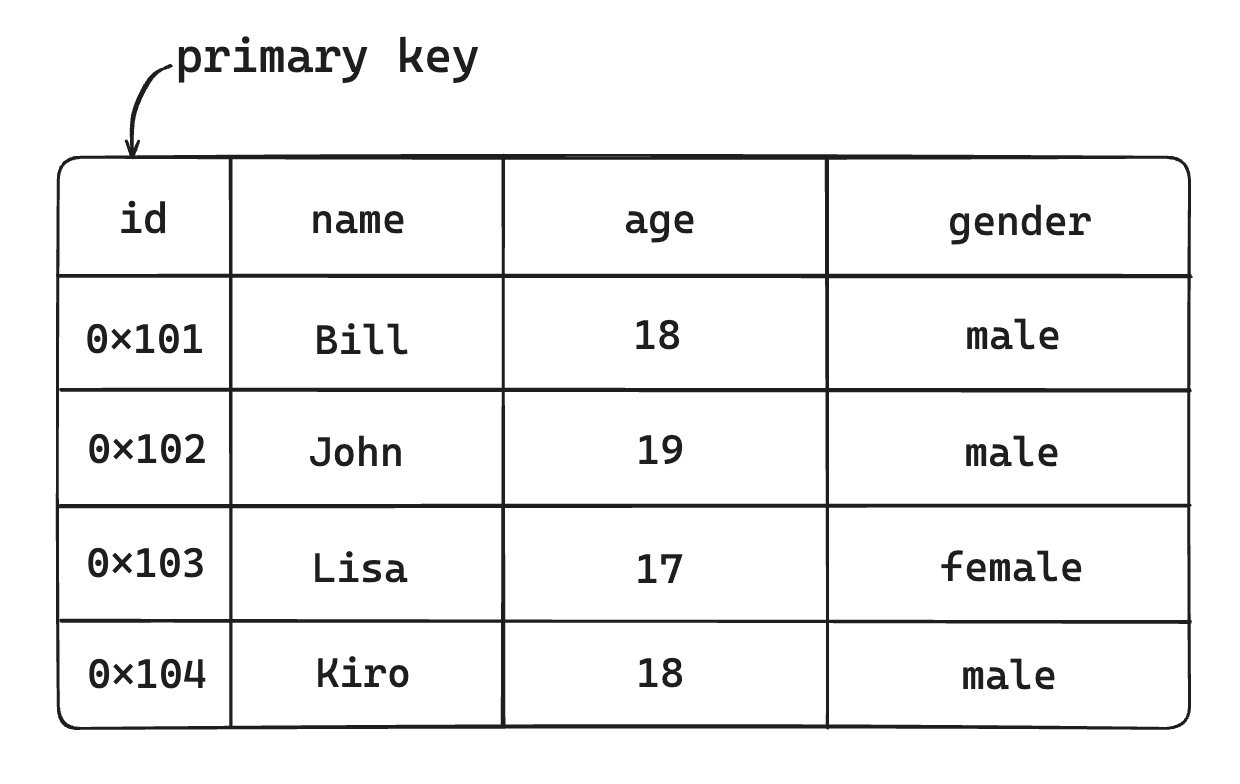 在关系型数据库中,primary key 用于标记这条数据的唯一性,因此在上表中只有 id 这个字段能够作为主键,另外 3 个字段都不行。