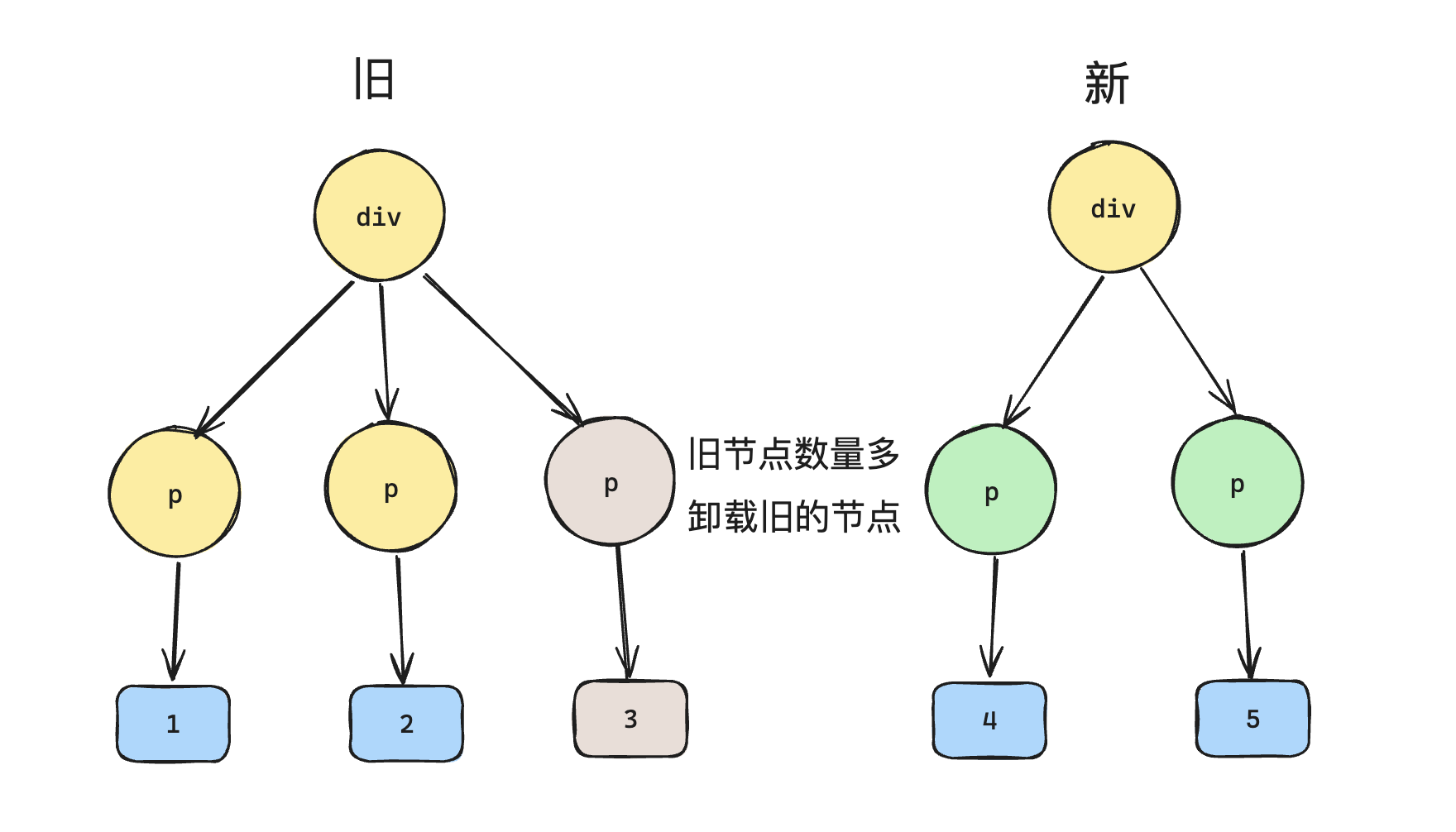 - 卸载所有旧的子节点,需要 3 次 DOM 的删除操作