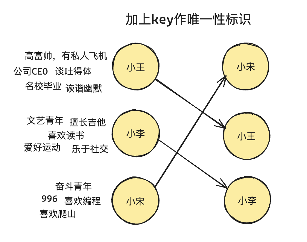 Vue 中的 key,道理就是一样的,key 其实也是用来做唯一标识,谁的唯一标识呢,就是虚拟节点 VNode 的唯一标识。